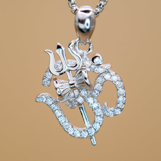 Sterling Silver Trishul Dumru Om Pendant (White CZ Gemstones, Rhodium plating, Pendant only, without chain)