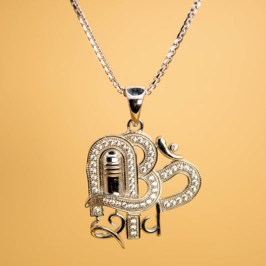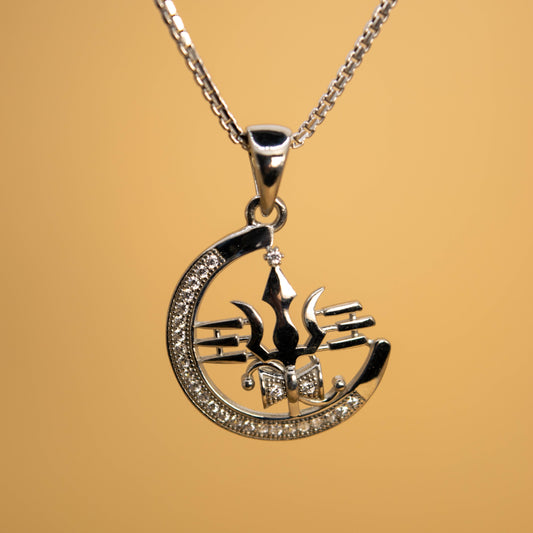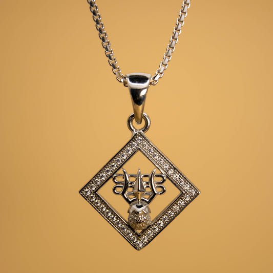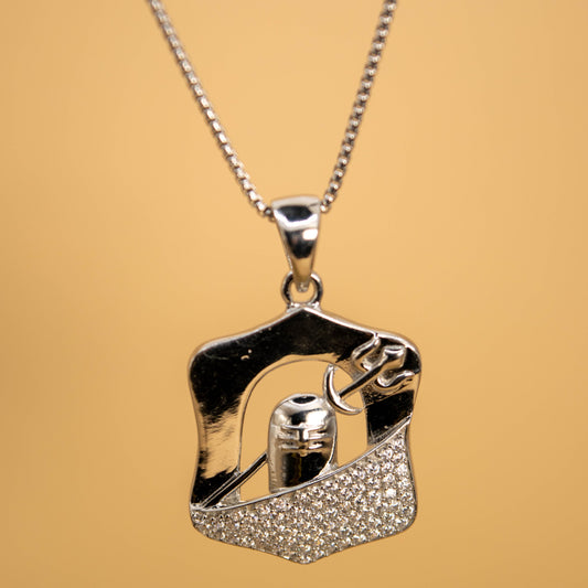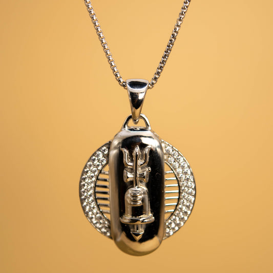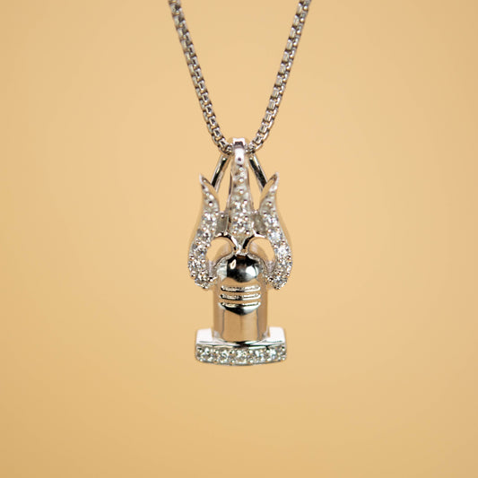 Sterling Silver Trishul Shivling Pendant (White CZ Gemstones, Rhodium plating, Pendant only, without chain)