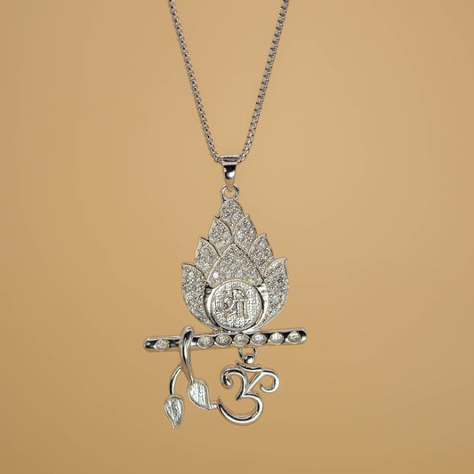 Shree Om Flute Pendant in Silver (White CZ Gemstones, Rhodium plating, Pendant only, without chain)